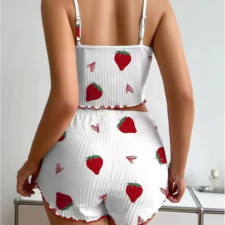 O Conjunto de Pijama Feminino com Estampa de Morango em malha canelada de seda gelada foi criado para oferecer uma sensação imediata de frescor e suavidade na pele, eliminando o desconforto do calor e das roupas que apertam. Você sente o toque geladinho desde o primeiro uso, dorme melhor e acorda mais relaxada.